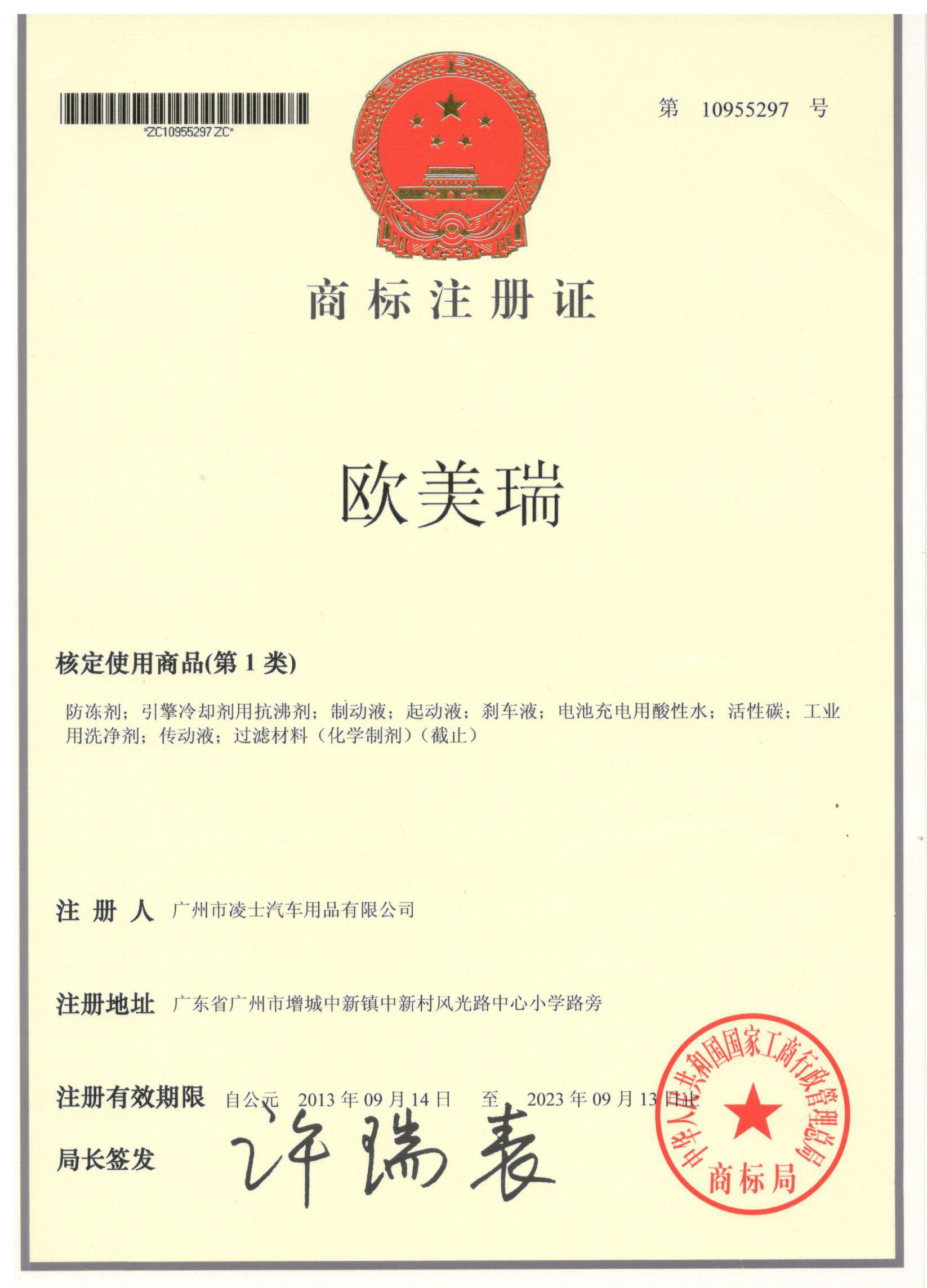 歐美瑞商標(biāo)注冊證
